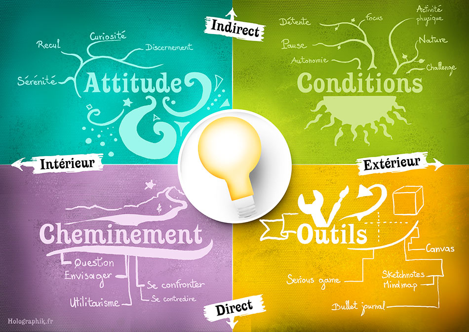 L'attitude : c'est un état d'esprit, une attitude mentale pour favoriser la créativité. Elle sera faite de recul, de curiosité, de discernement aussi. Le tout sans pression inutile.