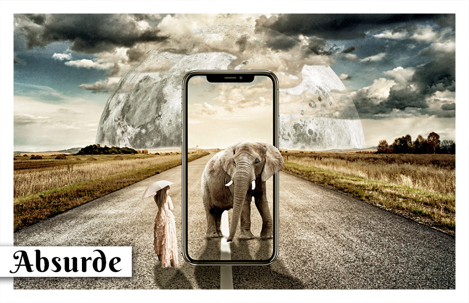 Par exemple, je m’imagine dans cette image. Je suis un peu derrière le téléphone portable, je vois donc un peu le dos du téléphone, et le bout d’oreille de l’éléphant qui en sort.