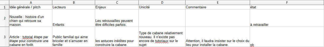 Voilà, vous pouvez désormais stocker ça dans un fichier dédié. Un fichier excel fait très bien l’affaire. Les éléments précédents sont vos colonnes, chaque projet d’écriture tient sur une ligne. Vous pouvez également ajouter une colonne état comme précisé dans la partie sur la collecte des pistes.