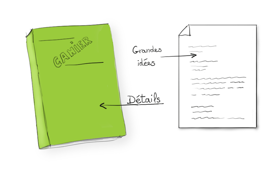 D'un côté les grandes idées. De l'autre, les détails. Sur le fichier, on retrouve vite. Sur le cahier, on peut prendre des notes visuellement, comme les cartes heuristique ou des sketchnotes