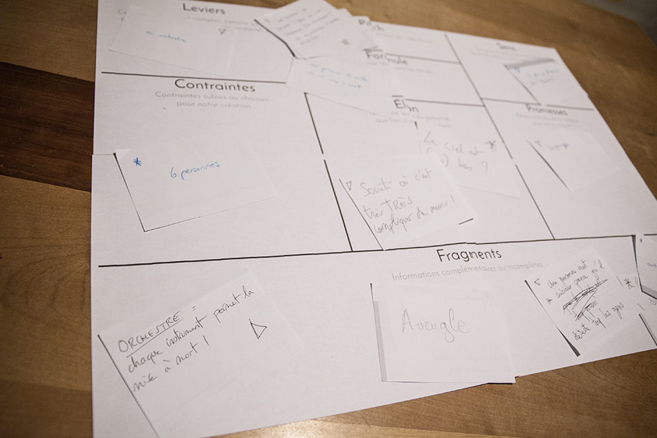 Dans la lignée de notre élan précédent, les participants avaient inscrit comme levier : orchestre. Cette idée n’a pas été poursuivie jusqu’au bout finalement. Une idée, cependant, en est ressortie : “Orchestre = chaque instrument permet la mise à mort”.