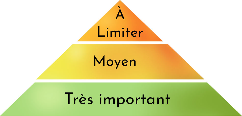 En bas, ce qui est essentiel. Beaucoup d'eau, puis des légumes et des fruits. Et ensuite, plus on monte, moins c'est prioritaire.