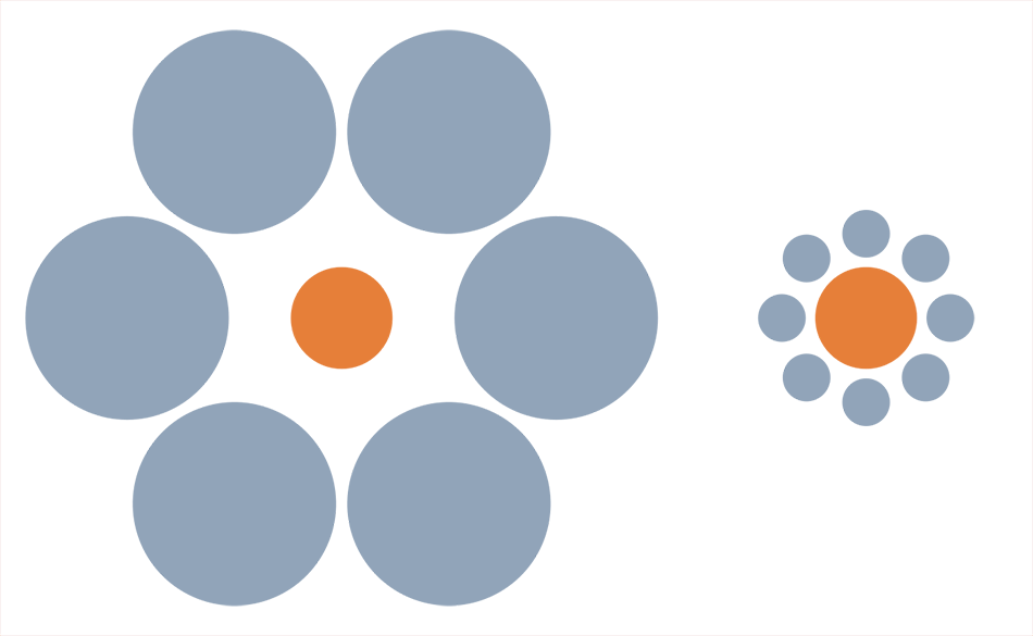 Alors qu'il y a la même quantité de nourriture dans les deux assiettes, on mange moins si l'assiette est petite. Regardez cette image. Le rond orange est pourtant identique à gauche et à droite.
